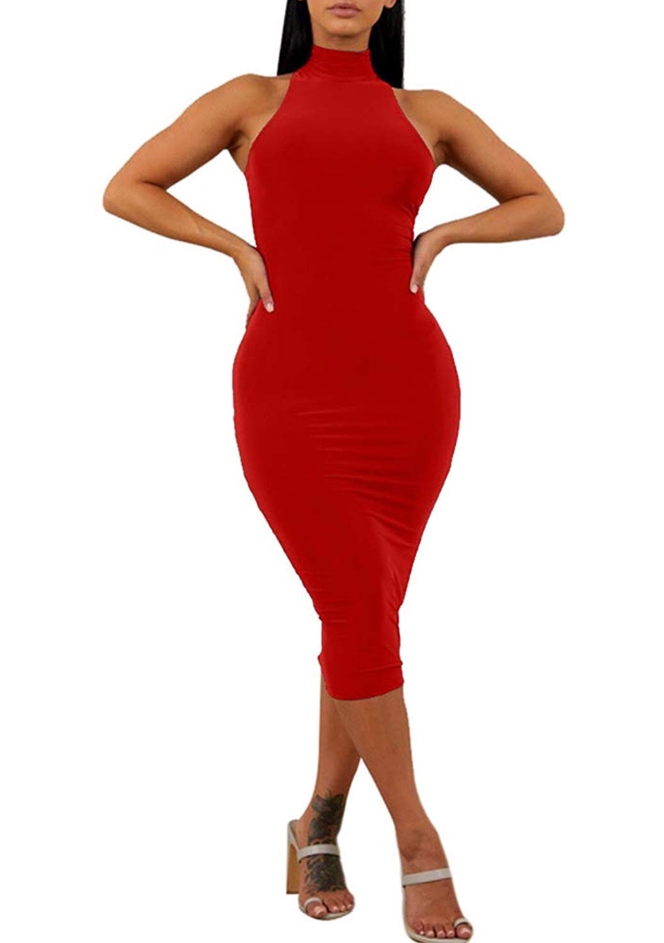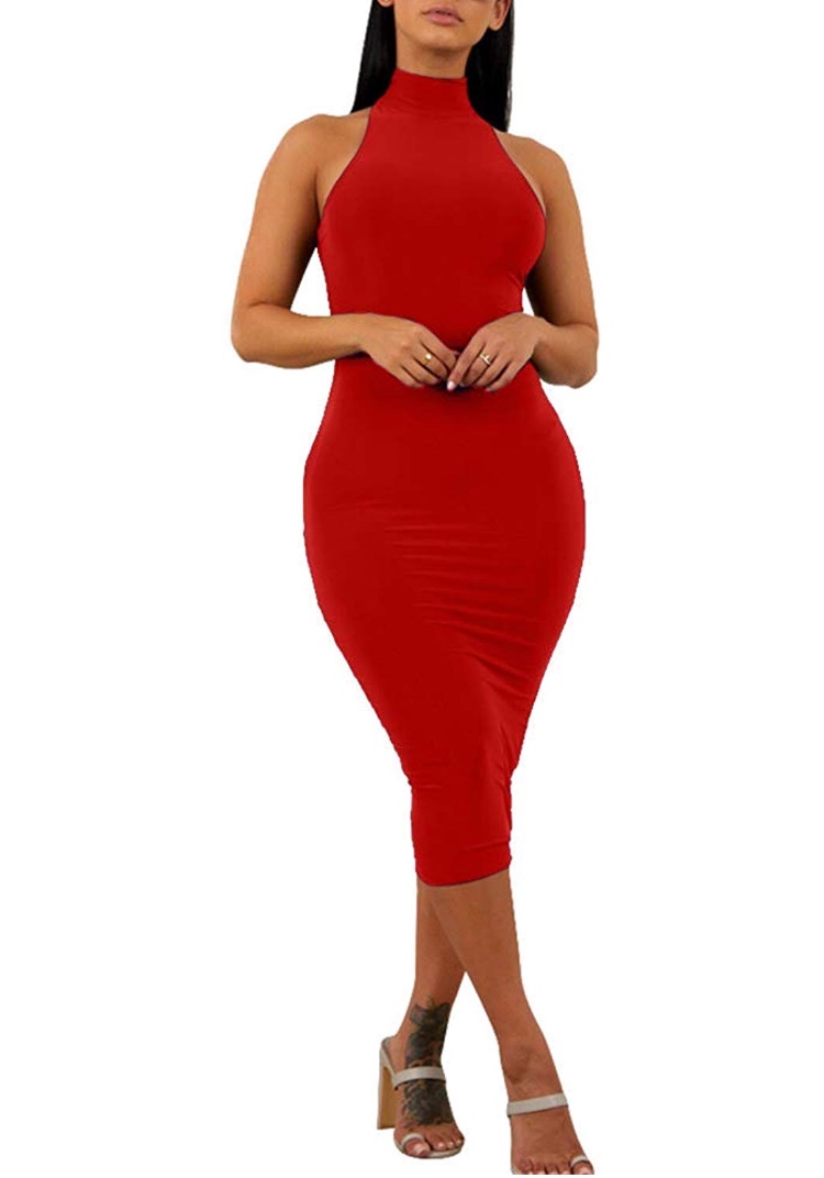 High turtle neck,sleeveless,bodycon,midi-length,hidden zipper in the back