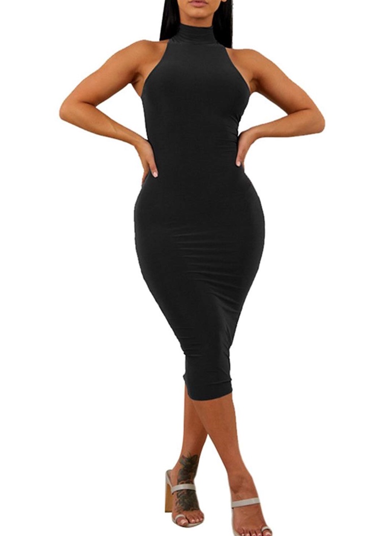 High turtle neck,sleeveless,bodycon,midi-length,hidden zipper in the back