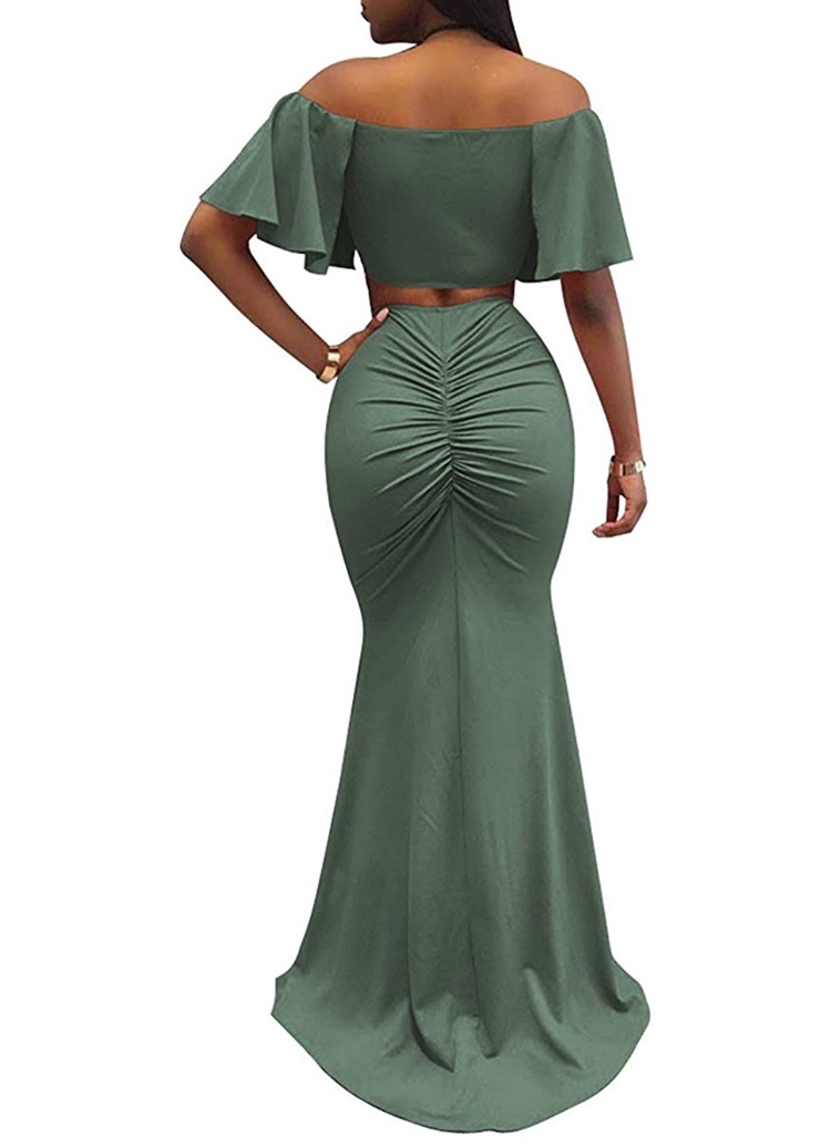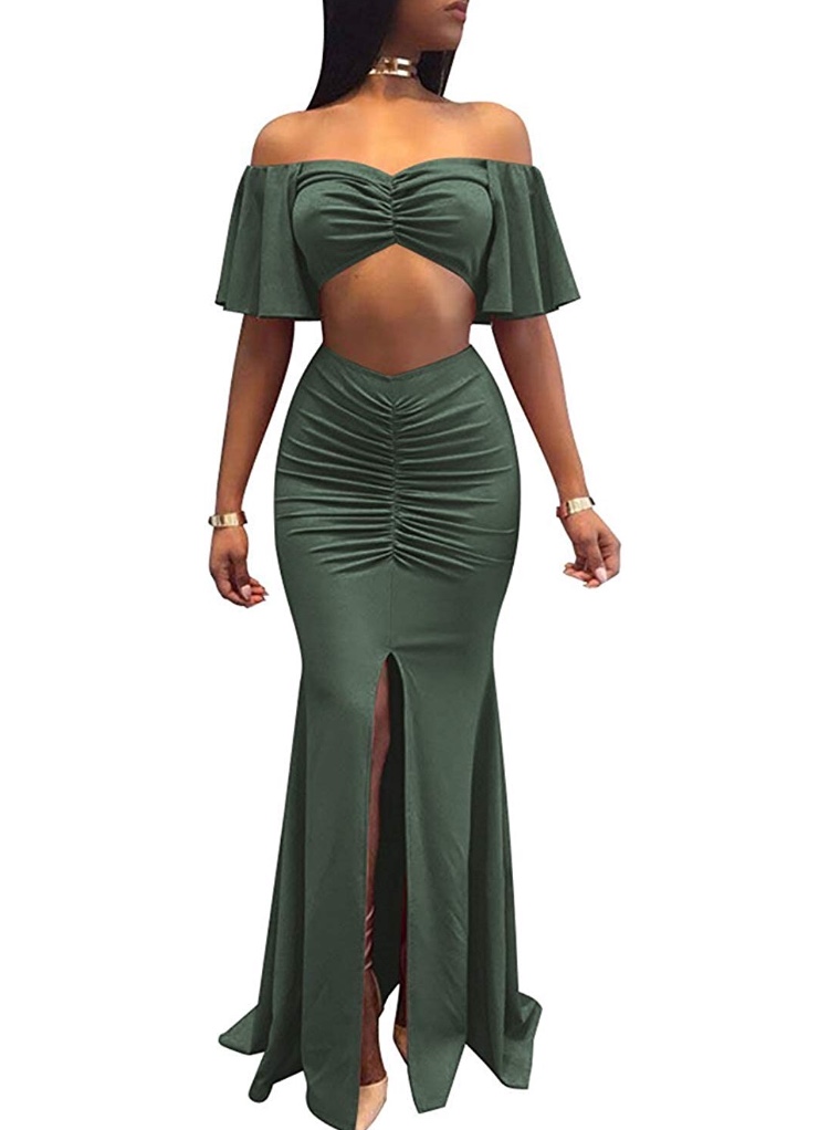 Off Shoulder,Ruffle Sleeve,Ruched,Slit Front,Maxi length,Bodycon,Solid Color,Slim Fit