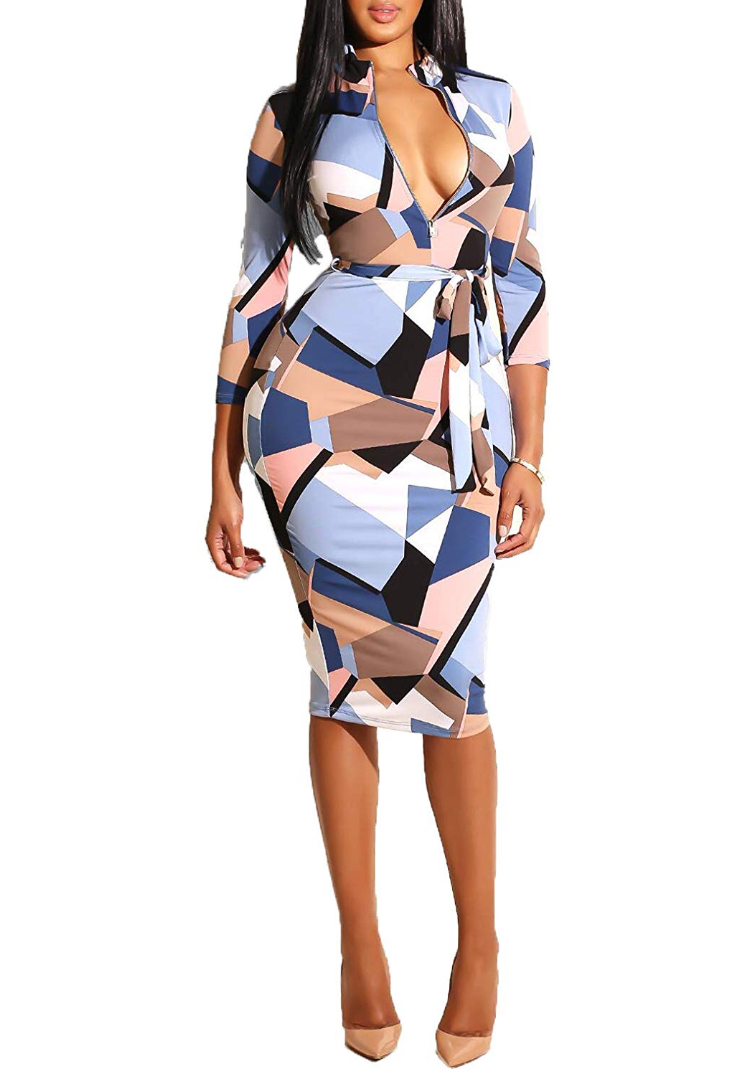 FEATURES: Stand collar, v neck, front zipper, long sleeve, one piece, 3 colors, slim fit. The bodycon dress can show your charming curve