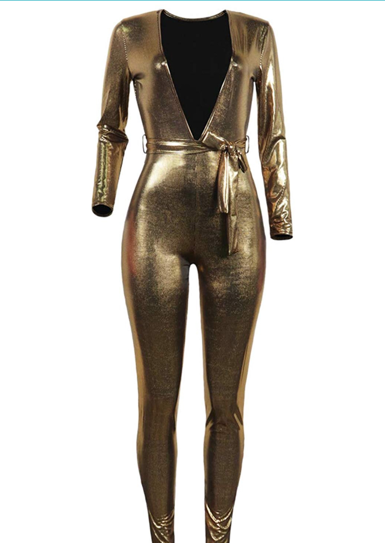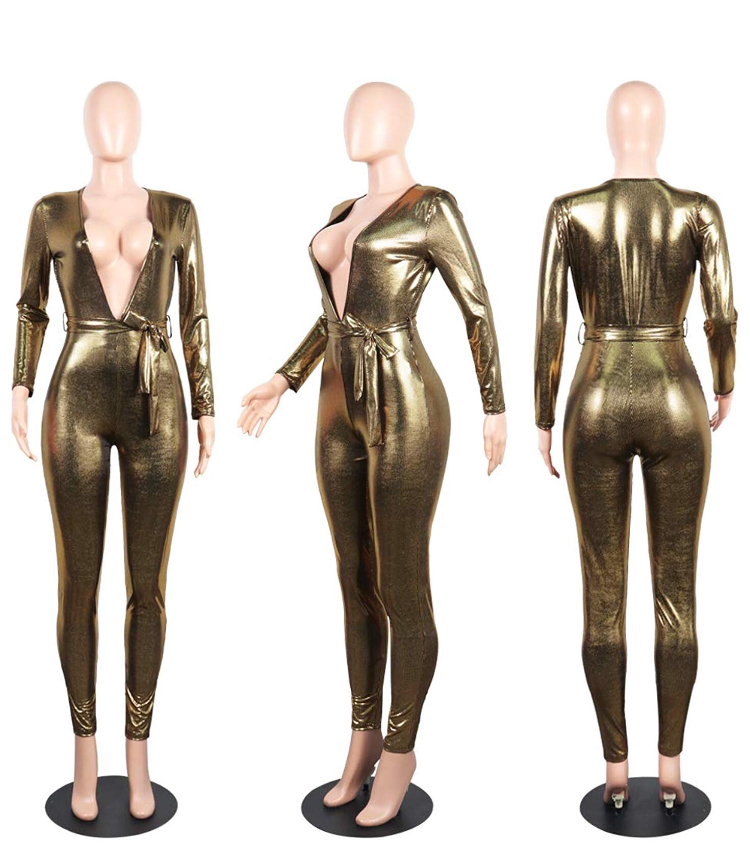 •Glitter jumpsuit long sleeve, sexy deep v-neck, bandage tie waist / belted , skinny long pants jumpsuits rompers