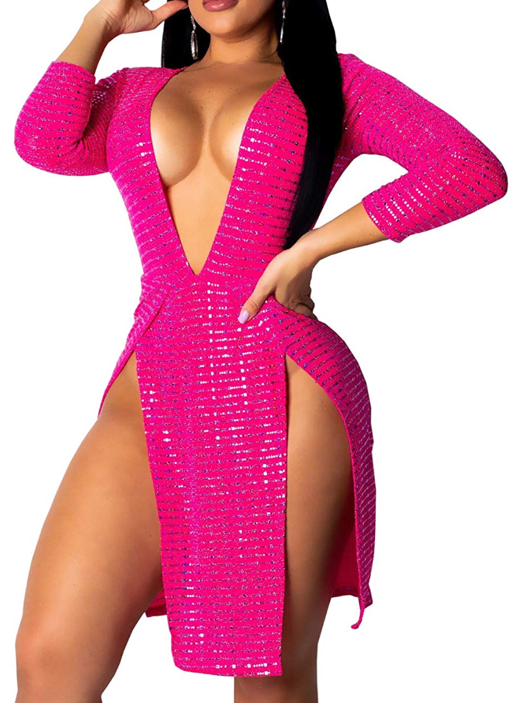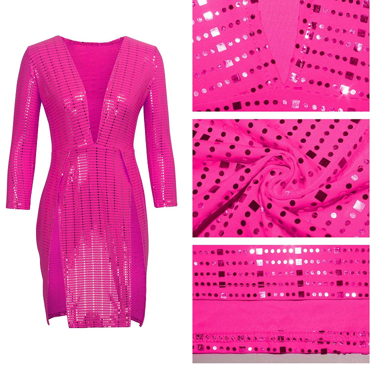 Features:Sexy sequins-embellished,deep V-neck,3/4 Sleeves,side split,sexy slim mini clubwear dress.Eye-catching design with great a incrediable sexy body shape for you.