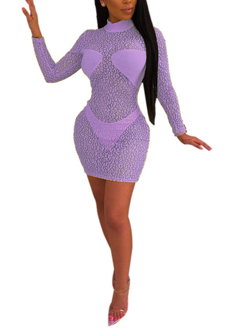Long Sleeves, Gauze See Through Sleeve, High Neck,See Through, Above the knee, Bodycon Miniskirt.